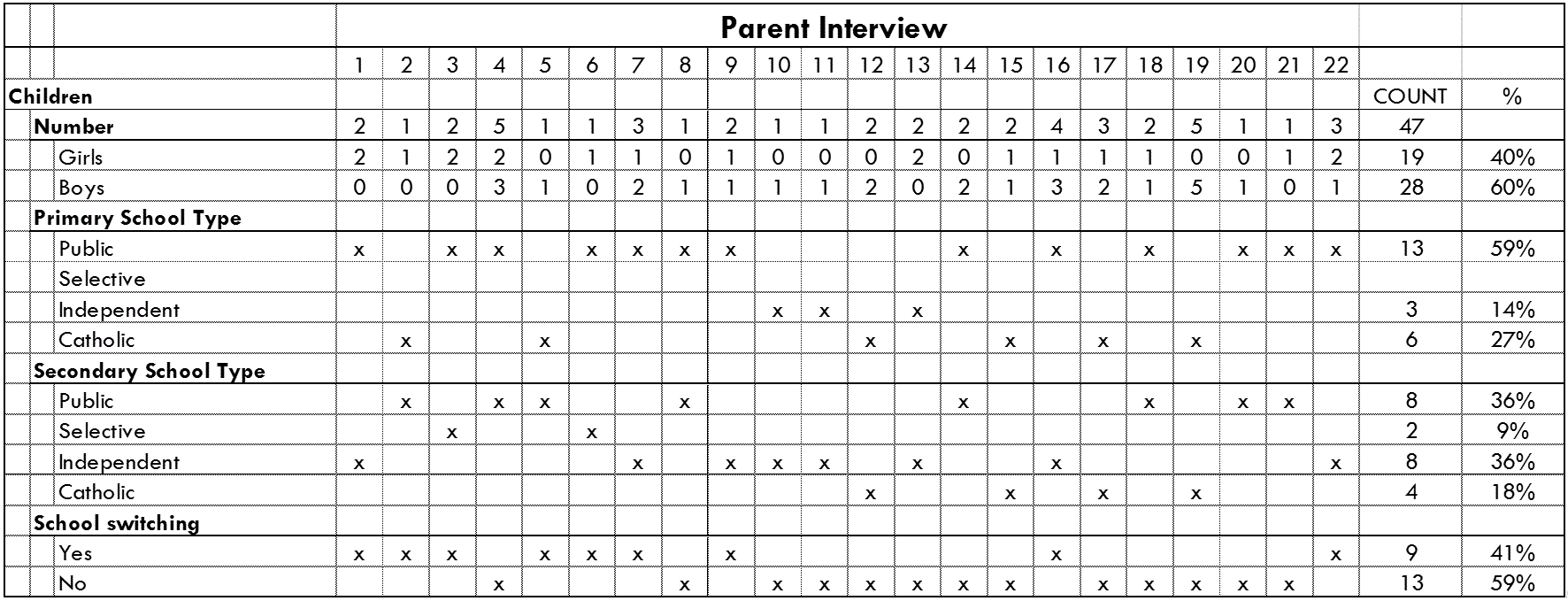 The table below provides some detail as to the level diversity of the interviewed parents.  It is important to note that the focus of the study was to explore and understand the decision architecture of how parents choose a school for their children.  Consequently, a degree of priority was given to finding parents who had switched schools from public to private (independent/Catholic) or from private to public in the transition from primary to secondary schooling.