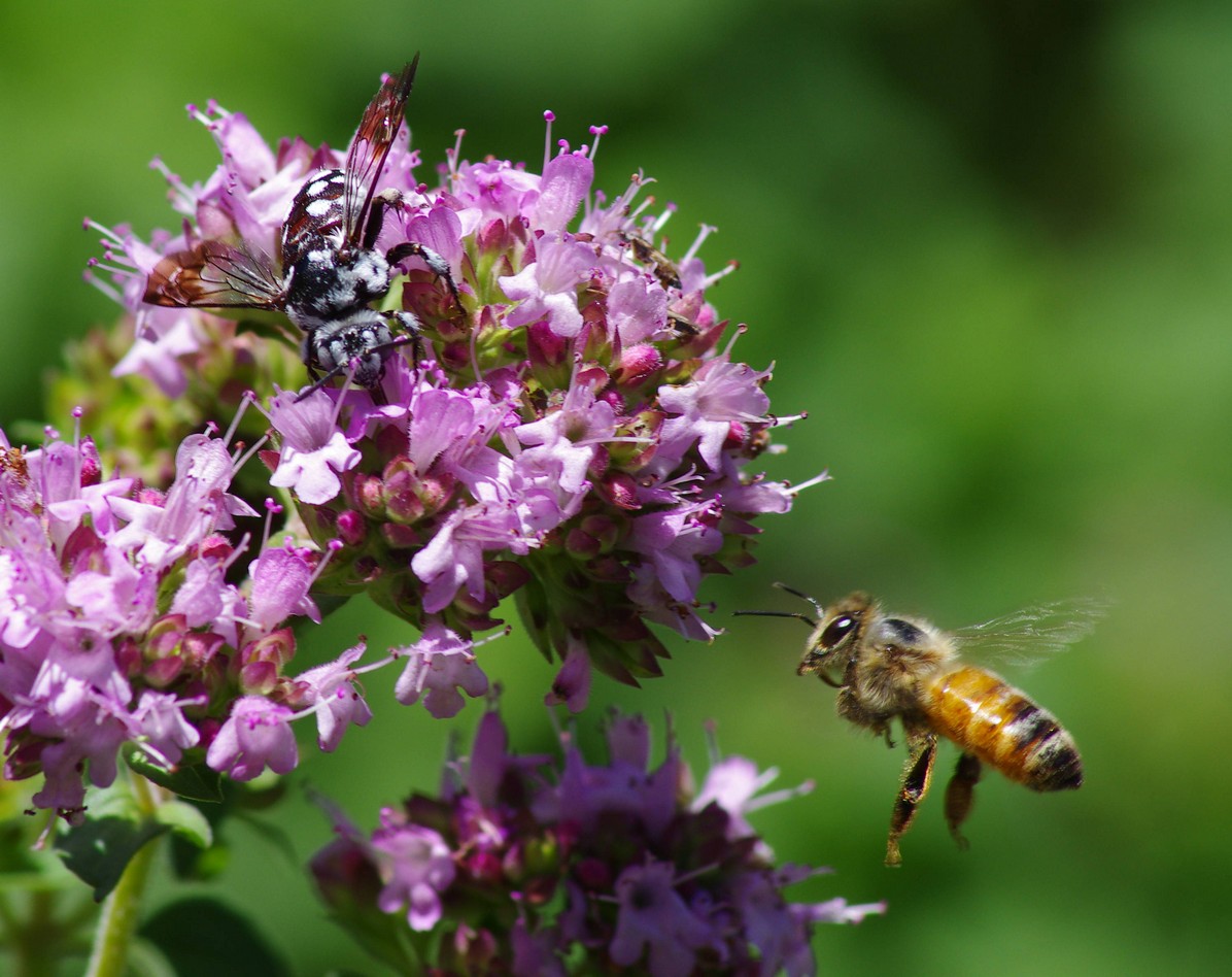 I captured a photo of the eusocial Honey Bee Apis mellifera and parasitic Chequered Cuckoo Bee Thyreus caeruleopunctatus together on oregano flowers in my garden today.